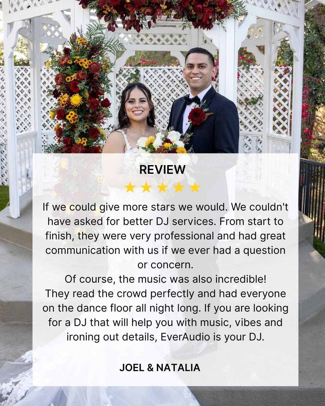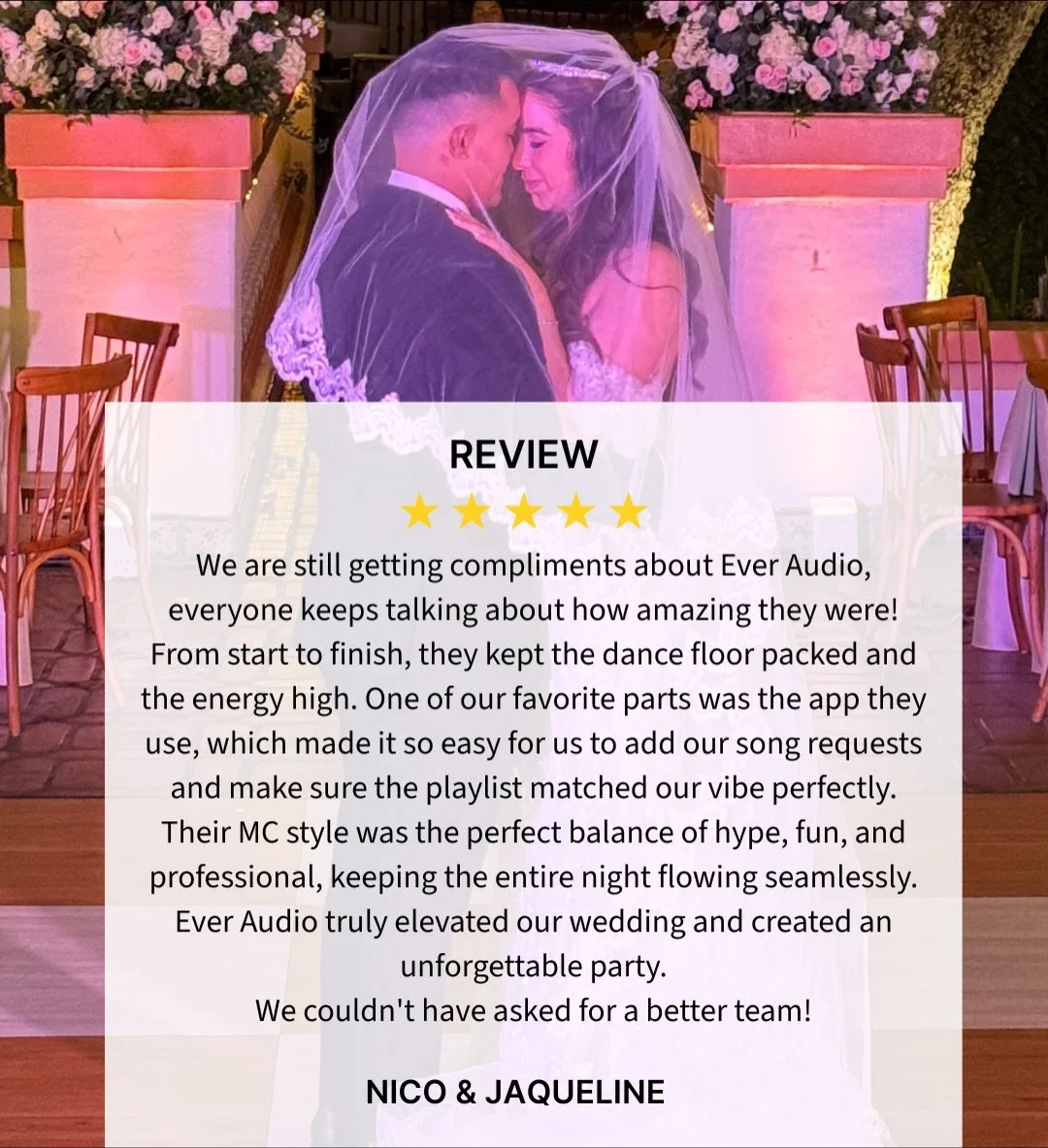 At EverAudio, we are dedicated to bringing your unique vision to life through unforgettable experiences tailored to your tastes and preferences. Our mission is clear: crafting good vibes, setting the perfect musical backdrop, and creating lifelong memories on your special day.